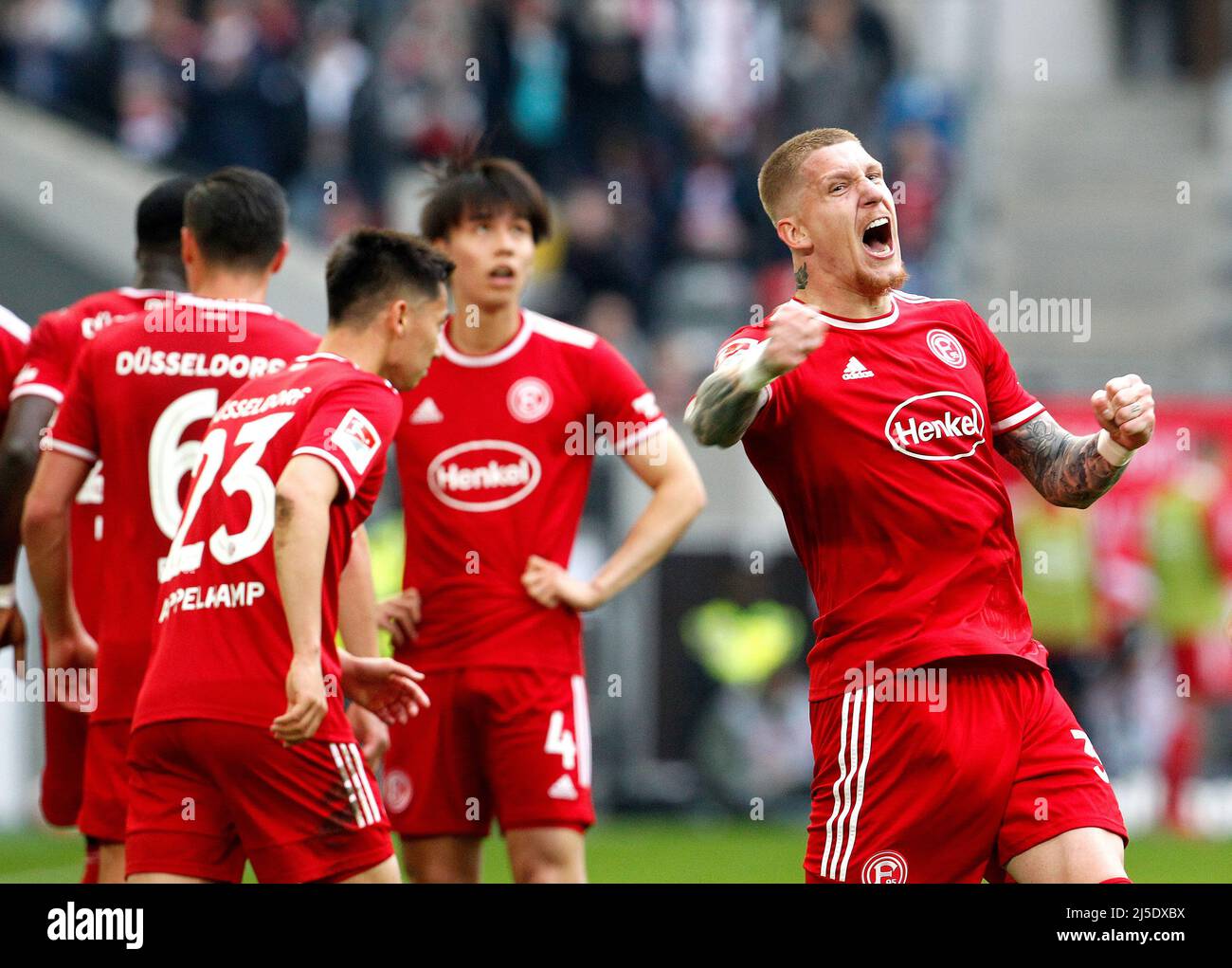 Duesseldorf Germany 22nd Apr 2022 Soccer 2nd Bundesliga Fortuna Dusseldorf Dynamo Dresden Matchday 31 At Merkur Spiel Arena The Dusseldorf Scorer For 2 0 Jordy De Wijs R Cheers With The Team Credit